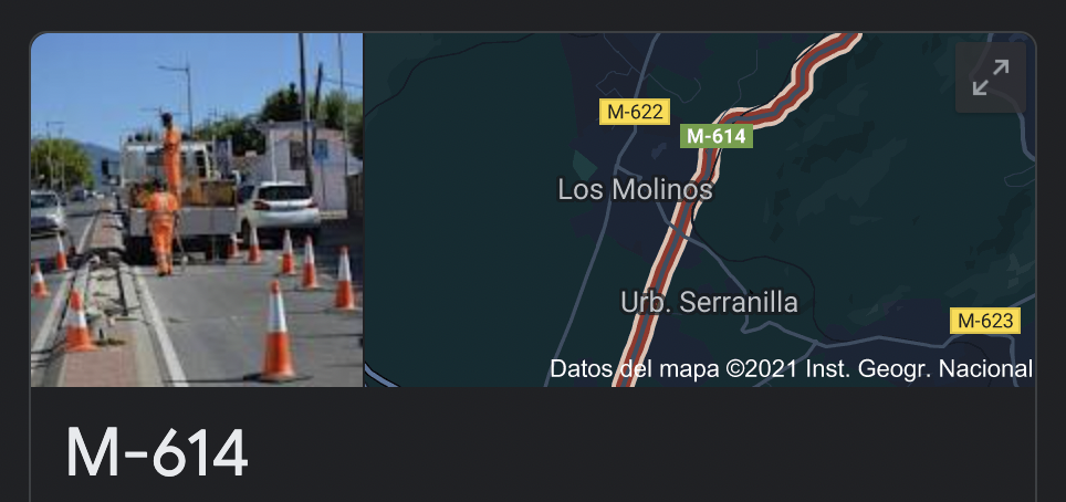 La Comunidad de Madrid concluirá a lo largo de esta semana del 4-10 octubre los trabajos de renovación y mejora del firme de la carretera M-614 en el tramo comprendido entre la autopista AP-6 (p.k. 11,380) y la M-600 a la altura del municipio de Los Molinos.