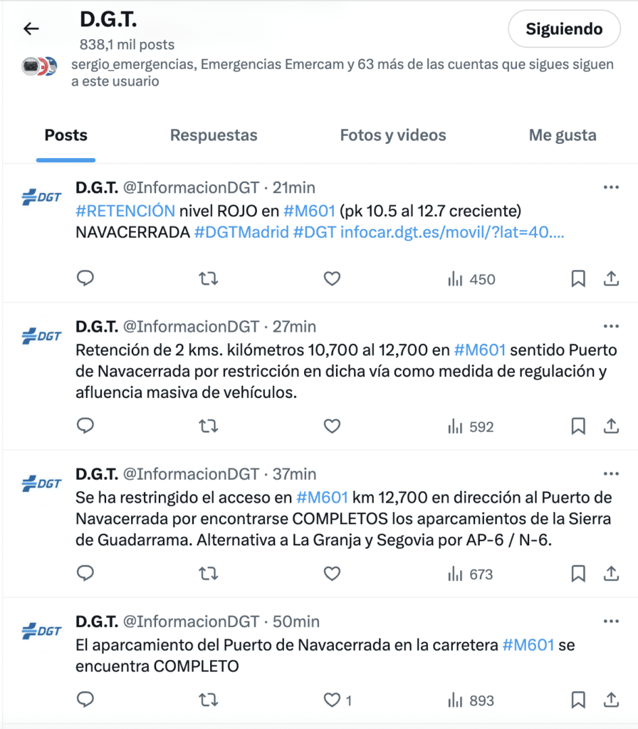 Consulta la última hora de la DGT antes de emprender la subida a la sierra de Madrid para ver si la M-601 está abierta o cerrada al tráfico.