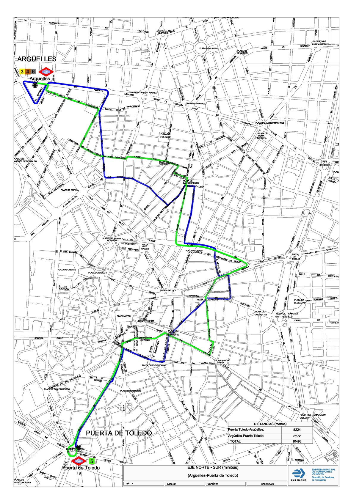 Las cabeceras de la línea se situarán, igualmente, en relevantes nudos de la red de la EMT y Metro y llegarán a Argüelles por el norte y a Puerta de Toledo por el sur.