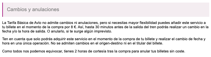 La Tarifa Básica no admite cambios ni anulaciones, pero puedes añadirlos a tu billete por tan solo 8 €. Así tendrás derecho a realizar un cambio en la fecha y/o la hora del viaje, o a anularlo si te surge algún imprevisto. No se admiten cambios en el origen-destino del billete ni en el titular. Ten en cuenta que solo podrás adquirir este servicio en el momento de la compra y realizar cambios en una única operación hasta 30 minutos antes de la salida del tren.