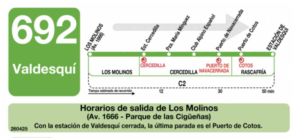 Debido al estado de las carreteras y para garantizar la seguridad de los pasajeros, la línea finalizará su recorrido en el pueblo de Navacerrada. Por tanto, queda totalmente suspendido el tramo comprendido entre Navacerrada y el Puerto de Cotos.