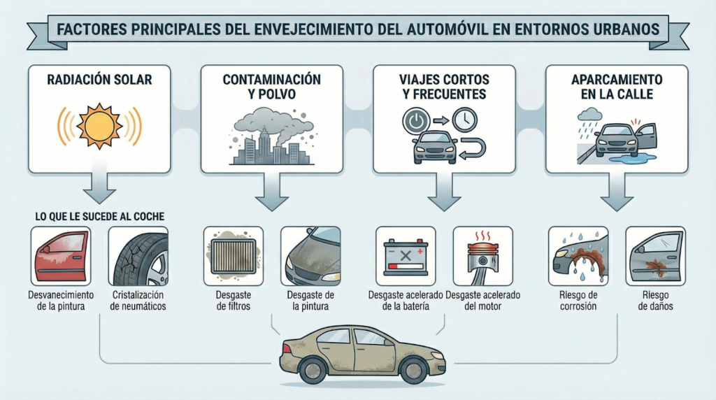 La infografía muestra los cuatro factores principales del envejecimiento del automóvil en entornos urbanos y sus consecuencias específicas. La radiación solar causa desvanecimiento de la pintura y cristalización de neumáticos. La contaminación y el polvo provocan desgaste de filtros y deterioro del acabado. Los viajes cortos y frecuentes aceleran el desgaste de la batería y el motor. Finalmente, el aparcamiento en la calle incrementa el riesgo de corrosión y daños físicos al vehículo.