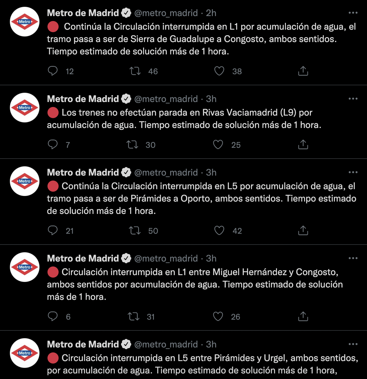 Tras la tormenta de la madrugada del martes 31 al agosto al miércoles 1 de septiembre de 2021, varias líneas de Metro tienen tramos cortados por inundaciones a primera hora del día. Los viajeros han optado por viajar en autobús, aprovechando además la gratuidad que la EMT ofrece del 1 al 15 de septiembre de 07.00 a 09.00 horas.