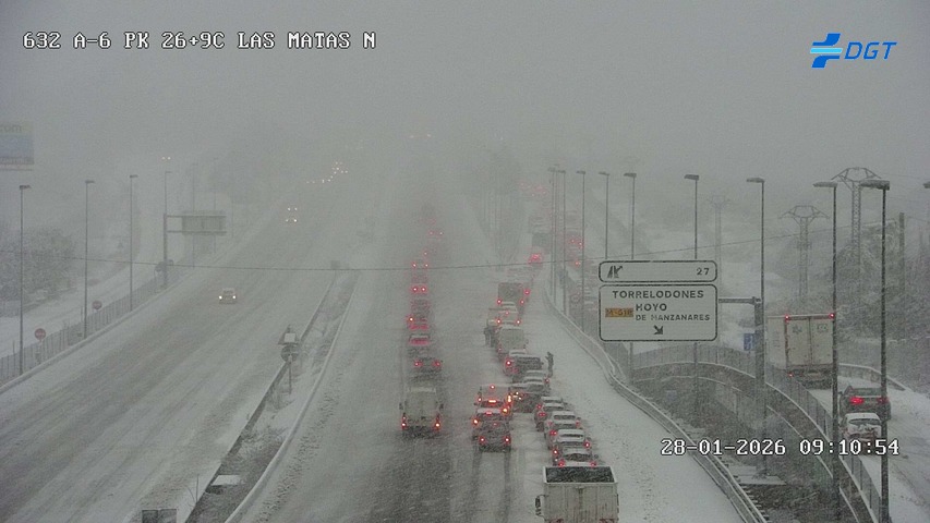 La jornada de este miércoles, 28 de enero, ha comenzado con escenas de absoluto caos en la Autovía de La Coruña (A-6) y sus carreteras adyacentes. Una intensa y repentina nevada de madrugada ha sorprendido a cientos de conductores, dejando la calzada prácticamente impracticable en varios tramos y provocando retenciones kilométricas que afectan a los accesos hacia la capital.
