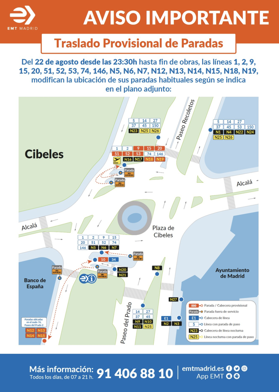 Desde las 23.30 horas del domingo 22 de agosto hasta el viernes 27 de agosto, se verán afectadas las siguientes paradas de las líneas diurnas: 1 (Cristo Rey – Prosperidad), 2 (Manuel Becerra – Reina Victoria), 9 (Sevilla – Hortaleza), 15 (Sol/Sevilla – La Elipa), 20 (Sol/Sevilla – Pavones), 51 (Sol – Plaza Perú), 52 (Sol/Sevilla – Santamarca), 53 (Sol/Sevilla – Arturo Soria), 74 (Pintor Rosales – Parque Avenidas) y 146 (Callao – Los Molinos).