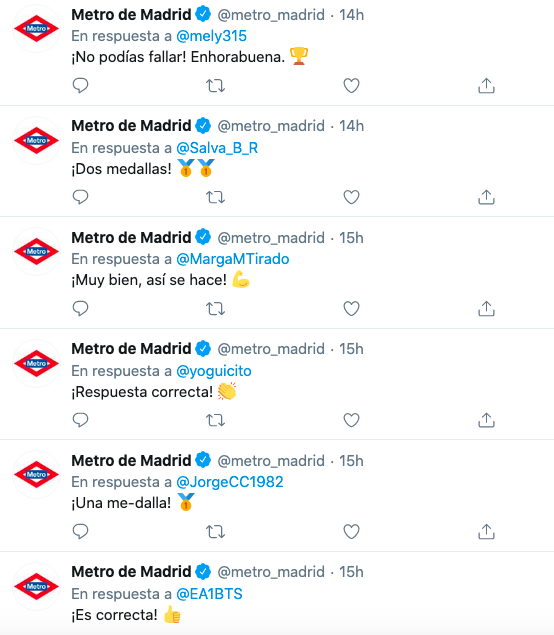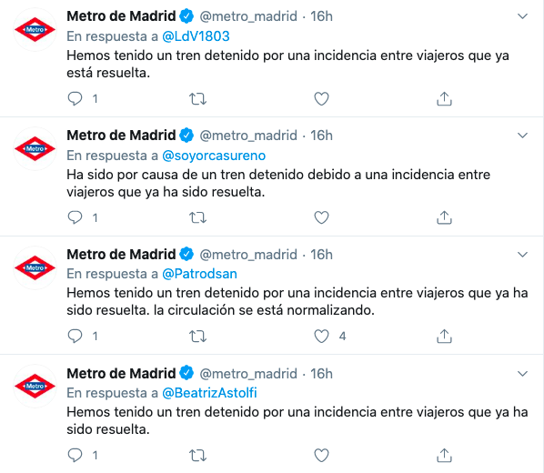 El gestor de redes sociales de Metro, que llevaba horas regalando medallas a los participantes de sus concursos en Twitter mientras se le acumulaban preguntas por incidencias respondía que todo se debía a “una incidencia entre viajeros, que ya estaba resuelta”: