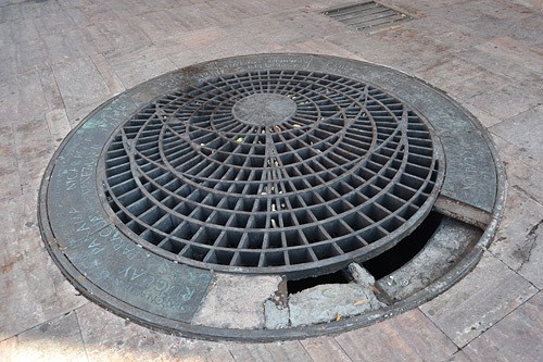 De todo el conjunto escultórico, el elemento más deteriorado es la placa del suelo, en forma de rejilla, con inscripciones circulares que recuerdan el día de su inauguración; situada entre las dos piedras principales, en la zona más alta del conjunto monumental. La placa está rota por uno de los lados y en su interior, creando un hueco de unos 25 centímetros de largo y 10 de ancho. La placa tapa un agujero de más de 10 metros de profundidad, que está lleno de botellas, vasos, cartones y otros restos de botellón.