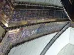 - Vista general del vestíbulo, se aprecian los pilares decorados de azulejos sevillanos y los antiguos lucernarios. Foto: A. Martínez Moreno