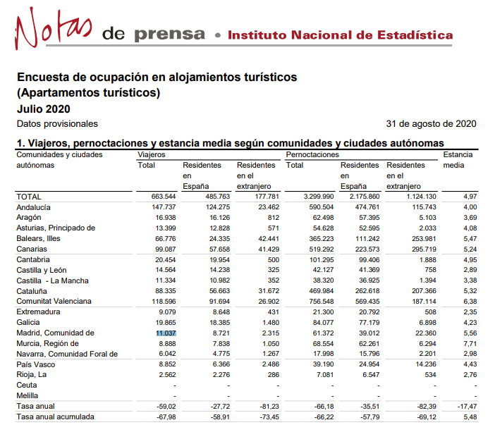 El Coronavirus ha dañado gravemente las economías de quienes alquilan apartamentos turísticos en Madrid. Según los datos publicados este lunes 31 de agosto de 2020 por el Instituto Nacional de Estadística (INE), durante el mes de julio de 2020 un total de 11.037 viajeros que optaron por alojarse en apartamentos turísticos en Madrid, con una estancia media de 5,56 días. Esa cifra supone un 76,51% menos que en el mismo mes de 2019.