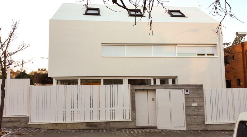 La heterogeneidad tipológica del entorno donde se ubica, configurado por antiguas viviendas pequeñas del desarrollo de Arturo Soria que se mezcla con edificación de los años 60 y edificación de vivienda colectiva de nivel adquisitivo alto de finales de los 90, ofrecía la oportunidad de realizar un ejercicio formal sencillo pero contundente, alejado de mimetizarse con el lugar y que, por el contrario, pretende singularizar este edificio en su entorno con mínimas herramientas formales.